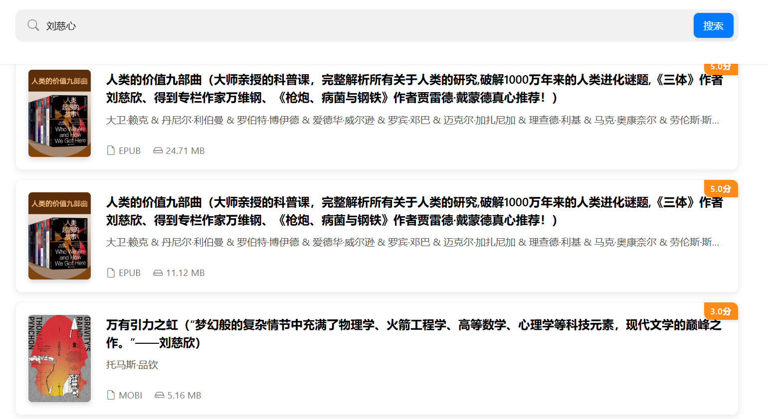 - 搜索书籍:在首页搜索框输入书名(如“《三体》”)或作者名(如“刘慈欣”),点击“搜索”按钮。